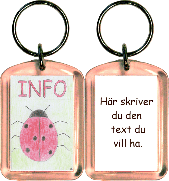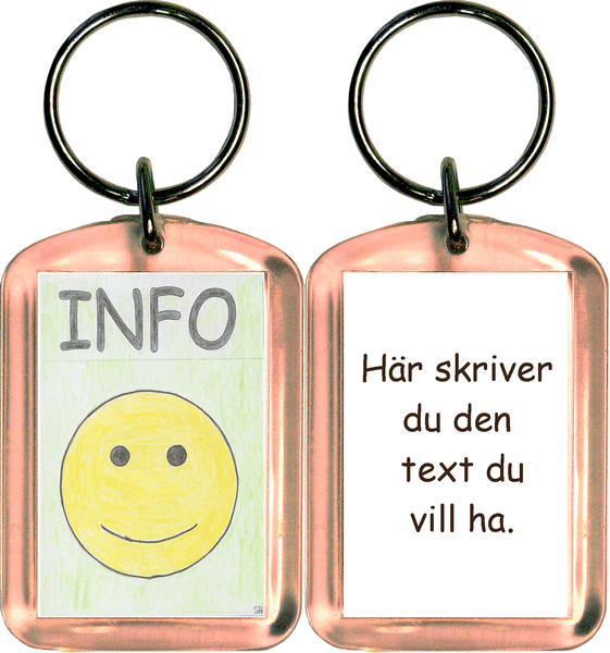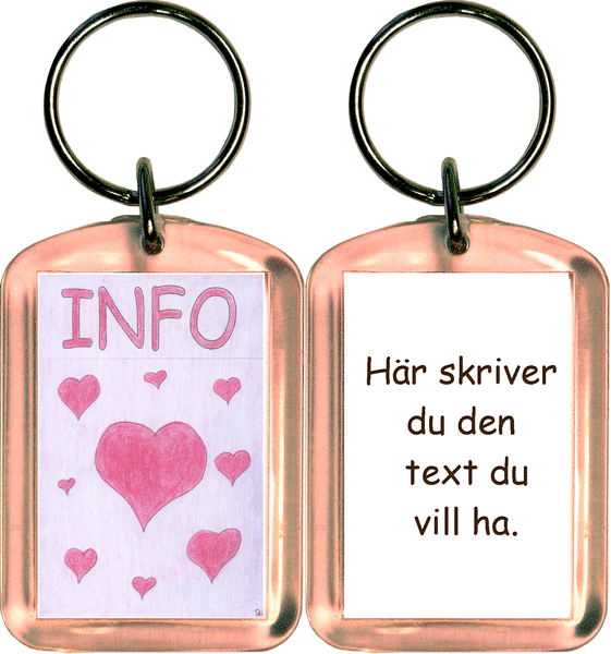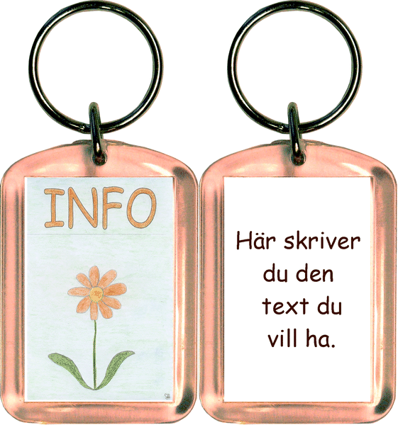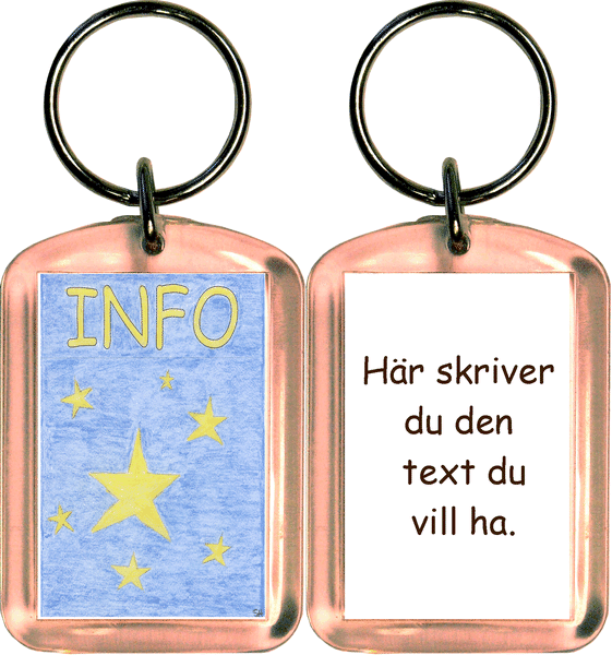 INFO-brickan är tillverkad av transparent plast, och tål regn och rusk. Mått: 4,7 x 3,2 cm (exklusive ringen).